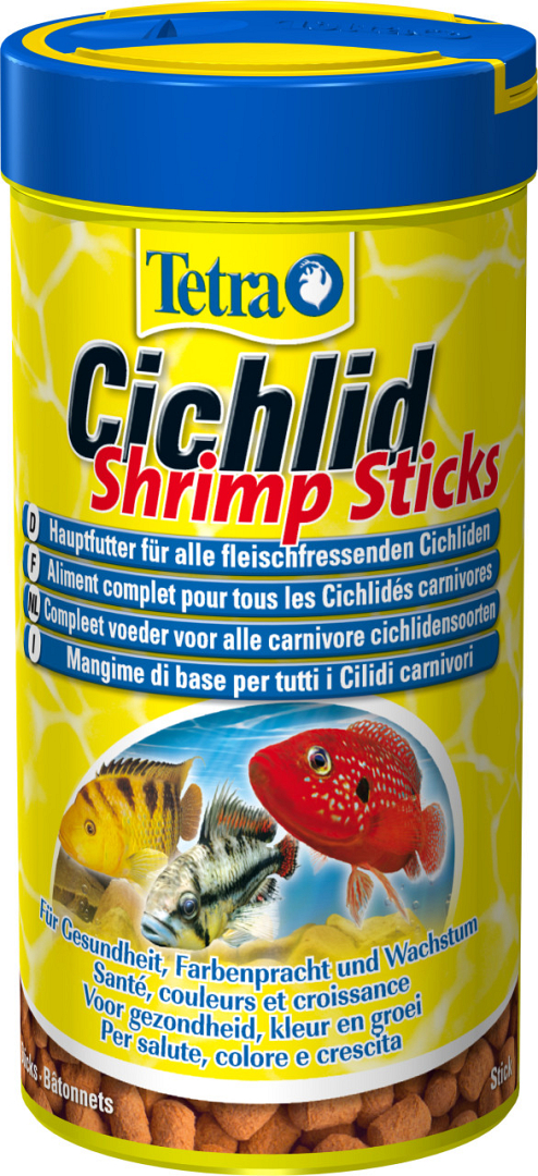 Tetra Cichlid shrimpsticks is een evenwichtig en gezond, volwaardig hoofdvoeder met groot aandeel gevriesdroogde garnalen, voor alle vleesetende cichliden.